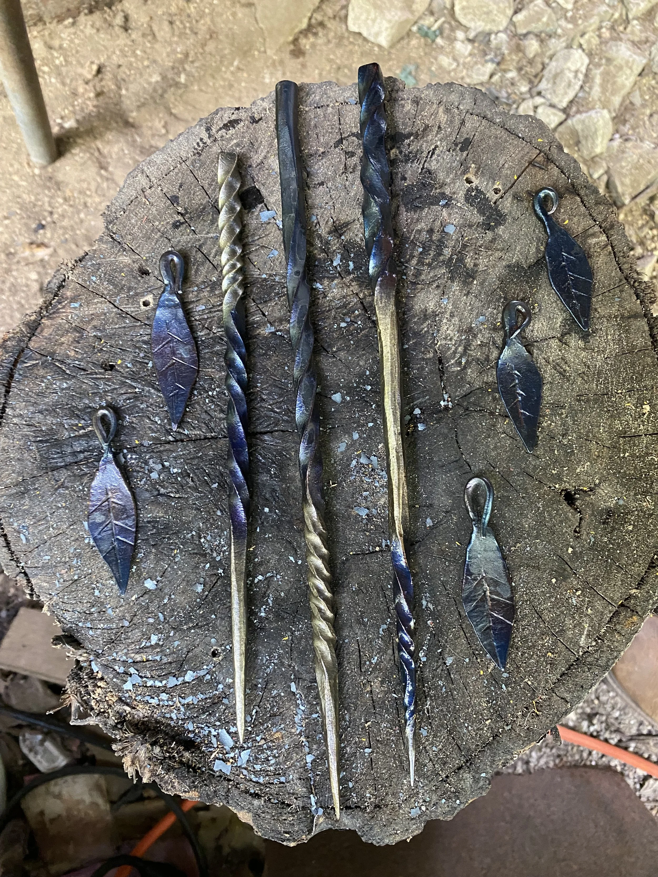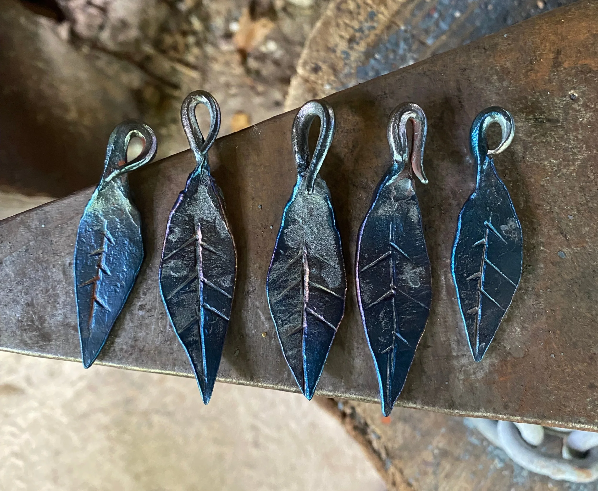 My latest (possibly greatest?) project was the result of being invited to an extremely fun party. We knew ahead of time to bring trinkets to trade, but I was blown away by how creative everyone was with the things they made and collected! I made these little steel leaves, which definitely got a bit more refined as I went along. Since the party was fairy-themed and steel isn’t traditionally a great gift for the fey, this also seemed like a good time to try out heat bluing for that added otherworldly effect.